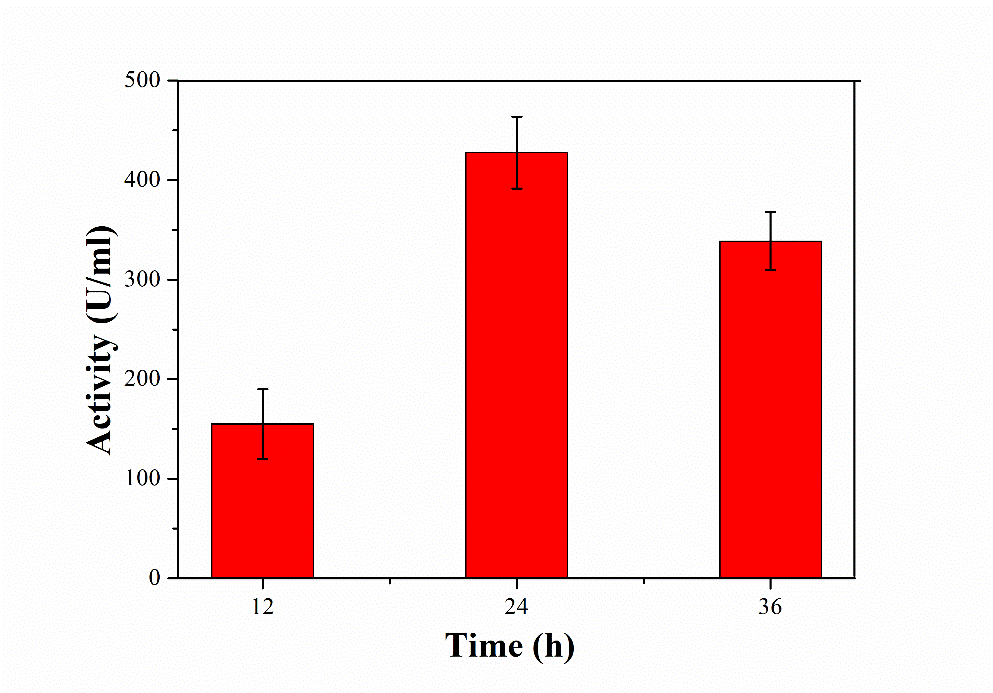 Fig. 1: Effect on time on protease production from B. subtilis. All values are expressed as mean±SEM (n = 3)