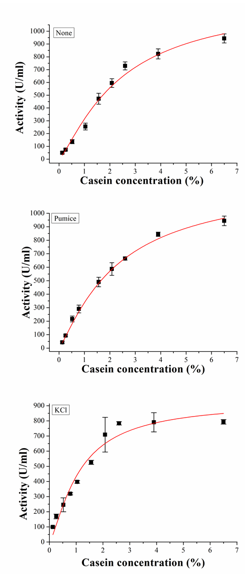 The kinetic parameters (Km and Vmax) of the lyophilized protease preparations (consisting of 98% KCl, 98% pumice, no addition) were also studied by using casein as a substrate. The kinetic parameters were calculated using Michaelis-Menten plots (fig. 5). Km, Vmax and catalytic efficiency values were given in table 3. It was found that the lyophilization with KCl and pumice resulted in an increasing in catalytic efficiency, while there is a decreasing in Km and Vmax values. Previously, Cruz et al. [13] obtained similar results with fumed silica. It can be said that lyophilization of enzyme with KCl and pumice enhanced the catalytic activity of the enzyme. Protease lyophilized with KCl showed higher catalytic efficiency compared with lyophilized with pumice and without additive enzyme preparations. Ru et al. [27] indicated that KCl produced the greatest activation for subtilisin Carslberg.