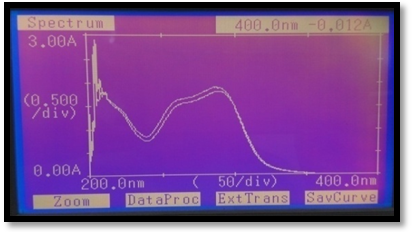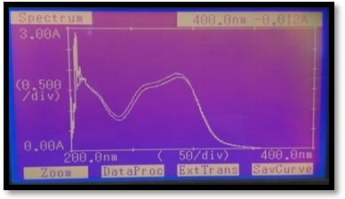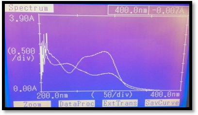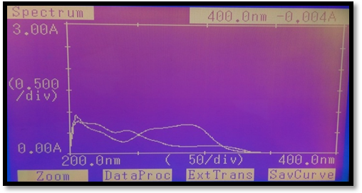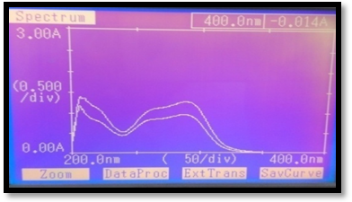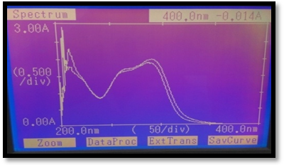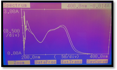 The photostability study of the drug was determined by exposing the drug under UV light, which provides illumination of NLT 200 watt hr/m2followed by cool white sunlight. After each exposure, accurately 1:16μg/ml photo exposed solution made for absorbance. The absorbance of the resulting solution was measured at 249.5 nm and 287 nm [18].