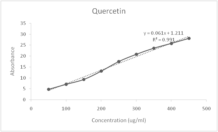 10 ml of methanol was added to 10 mg of the extract and mixed thoroughly using a vortex mixer. 0.5 ml of this solution was pipetted into a test tube and 1.5 ml methanol, 0.1 ml of 10% AlCl3, 0.1 ml potassium acetate and 2.8 ml of distilled water were added to it. The mixture was stirred properly and incubated for 30 min at room temperature. The absorbance was measured at 415 nm against a reagent blank. The total flavonoid content was calculated from the calibration curve of quercetin and expressed as mg of quercetin per gram weight of the dry extract.
