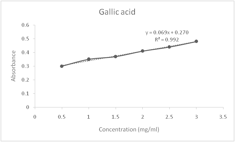 5 mg of the sample was dissolved in 5 ml of methanol using a vortex mixer. 0.5 ml of this solution was pipetted into a test tube and 3.5 ml of distilled water, 0.25 ml Folin-Ciocalteau reagent added to it. The mixture was incubated for 10 min at room temperature. Later, 0.75 ml of 20% Na2CO3 was added to it and left to incubate for 2h. The absorbance was measured at 765 nm against a reagent blank. The total phenolic content was calculated from the calibration curve of Gallic acid and expressed as mg of Gallic acid per gram weight of dry extract.
