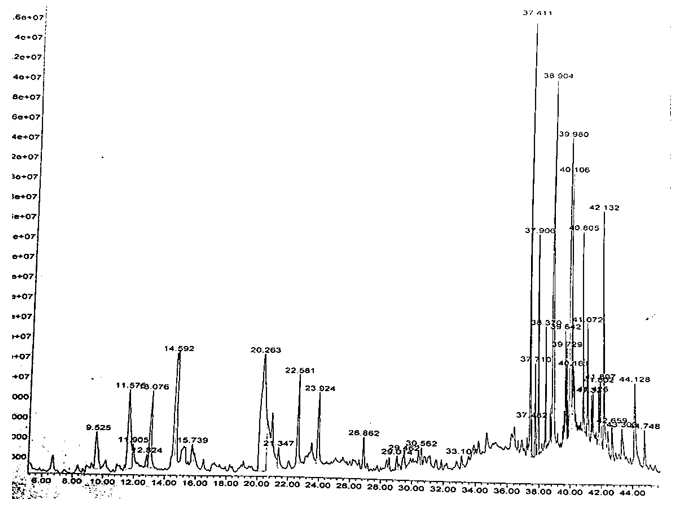 In the last decades GC-MS has been established as a key technological tool for profiling of secondary metabolites in both plants and non-plant species [20-22]. The present study was able to predict, and identify molecular formula and structure of some of the chemicals present in the methanolic leaf extract as presented in table 4. A total of thirty-seven compounds were separated by the GC as shown in the chromatogram in fig. 4. Twenty-five compounds were identified while twelve were unidentified. The MS of the unknown compounds were compared with those of NIST-2011 (National Institute of Standards and Technology) library stored in the computer database of the GC-MS equipment. These compounds were identified based on their molecular weight, peak area in percentage, retention time and molecular formula. The first compound to emerge was 5-methyl-2-furancarboxaldehyde with a retention time 9.53 min while the last to emerge was 2, 2, 4-trimethyl-3-(3, 8, 12, 16-tetramethylheptadeca-3, 7, 11, 15-tetraenyl) cyclohexanol with retention time of 44.75 min. The most abundant compound was catechol (14%) with the retention time of 20.263 min while the least was 2-hydroxy-3-methyl-2-cyclopenten-1-one (0.44%). Other compounds with an appreciable percentage in the methanolic extract are hexadecanoic acid (10.9%), 13-octadecenoic acid (7.9%) and 2-vinylfuran (5.7%). The GC-MS report revealed that the identified compounds are carbonyls, phenolics, fatty acids and fatty acid esters. The presence of these compounds in the plant leaves may be responsible for the plant medicinal properties.