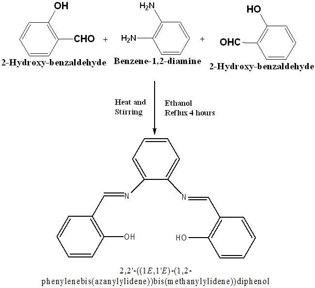 Ligand was prepared by the condensation reaction of 20 mmol of salicylaldehyde (2.1 ml) with 10 mmol (1.08g) of o-phenylenediamine in a round-bottomed flask. Salicylaldehyde was dissolved in 20 ml ethanol and o-phenylenediamine was dissolved in hot ethanol. The solutions were mixed and refluxed for 4 h. On cooling yellow-orange colored product was formed which was washed with ethanol, acetone, and diethyl ether and dried in vacuum desiccators over anhydrouscalcium chloride(CaCl2). The progress and purity of the ligand were tested by Thin layer chromatography (TLC) using different solvents. The product was found to be soluble in methanol, chloroform, and Dimethyl sulfoxide(DMSO). It provided 90% yield, color-yellow orange (fig. 1).