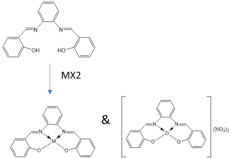 Methods: The ligand was synthesized by refluxing salicylaldehyde with o-phenylenediamine in ethanol, forming a yellow-orange product. The complexation reaction involved stirring ethanolic solutions of Zn(II), Cu(II), Ni(II), or Zr(IV) salts with a Schiff base ligand.
