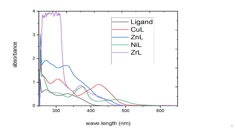 In DMSO at ambient temperature, the electronic spectra of the Schiff base and all metal complexes were taken (fig. 4). The magnetic moment values of the Schiff base ligand and its transition metal complexes, as well as their electronic absorption spectral data, are provided in table 3. The electronic spectra of the ligand have two absorption bands corresponding to n-π* and π-π* transitions. These transitions are present in the complexes' spectra as well, but they are shifted towards lower and higher frequencies, indicating that the ligand has coordinated with the metallic ions [13]. High-intensity absorption peaks at 277 nm and 339 nm in the electronic spectra of the ligand [C20H16O2N2] have been attributed to the π→π* and n→π* transitions, respectively [21]. The Zn(II) complex's UV-Vis spectra reveal the presence of three potent absorption bands at 265, 296, and 321 nm [22] The peak at 265 nm and 296 nm was assigned to π→π* and the peak at 321 nm is attributed to n→π* transition due to a lone pair of electrons of azomethine nitrogen and an antibonding orbital [23, 24]. Another absorption band at 395 nm in the spectra of the Zn(II) complex is probably because of ligand-to-metal charge transfer (LMCT) [21-24]. Electronic spectral data coupled with the magnetic moment value of the Zn(II) complex suggested the tetrahedral geometry of the [22]. The electronic absorption spectrum of the Cu(II) complex in DMSO solution showed three bands at 265 nm,320 nm, and 420 nm for π→π*, n→π*, and ligand-to-metal charge transfer (LMCT) respectively [25]. These data and the magnetic moment value of 0.60 B. M suggested tetrahedral geometry around Cu(II) [19]. The electronic absorption spectrum of the Ni(II) complex in DMSO solution showed four bands at 260 nm, 320 nm, 420 nm, and 480 nm for π→π*, n→π* ligand-to-metal charge transfer (LMCT) and 3A2g (F)→3T1g (F) respectively [26, 27]. These data and the magnetic moment value of 0.48 B. M suggested square geometry around Ni(II) [26]. Similarly, the ZrO(IV) complex electronic data was investigated and its magnetic moment value was 1.40 μ B. M, suggesting the square pyramidal geometry [28].
