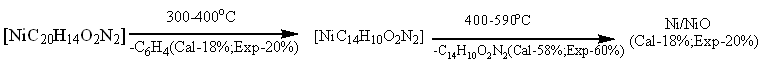 Indicating the absence of any lattice water molecules[1]. This complex was decomposed into three main steps, shown in fig. 5c. In the first step, the part of ligand (-C6H4) (calculated 18.00%, experimental 20.00%) was decomposed at temperature 300-400 °C. In 2ndstep, the decomposition of (C14H10O2N2-) (calculated 58.00%, experimental 60.00%) moiety took place at a temperature of 400-590 °C. Finally, the complex was completely decomposed and removed as Ni/NiO (calculated 18.0%, experimental 20%) [1, 2, 4].