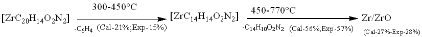 The Zr(IV) complex showed high thermal stability and decomposed above 250 °C, indicating the absence of any lattice water molecules[1]. This complex was decomposed into three main steps shown in fig. 5d. In the first step, the part of ligand (-C6H4) (calculated 21.00%, experimental 15.00%) was decomposed at temperature 300-450 °C. In 2ndstep, the decomposition of (-C14H10O2N2) (calculated 56.0%, experimental 57.00%) moiety took place at temperature 450-770 °C. Finally, the complex was completely decomposed and removed as ZrO/ZrO2 (calculated 27.00%, experimental 28.00%) [30].