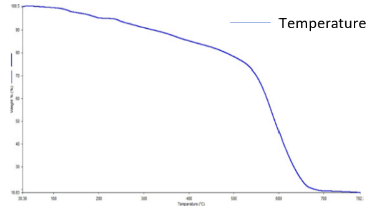 The thermogravimetric analysis (TGA) curve in (fig. 5b) suggested that the Cu(II) complex is thermally stable because it didn't degrade up to 200 °C[27]. In the first step, the part of ligand (-C6H4) (calculated 20.00%, experimental 20.00%) was decomposed at temperature 200-550 °C. In 2nd step, the decomposition of (C14H10O2N2) (calculated 62.0%, experimental 60.00 %)moiety was taken place at temperature 550-710 °C [25]. Finally, the complex was completely decomposed and removed as Cu/CuO (calculated 20.00%, experimental 20.00%) at above 710 °C [30].