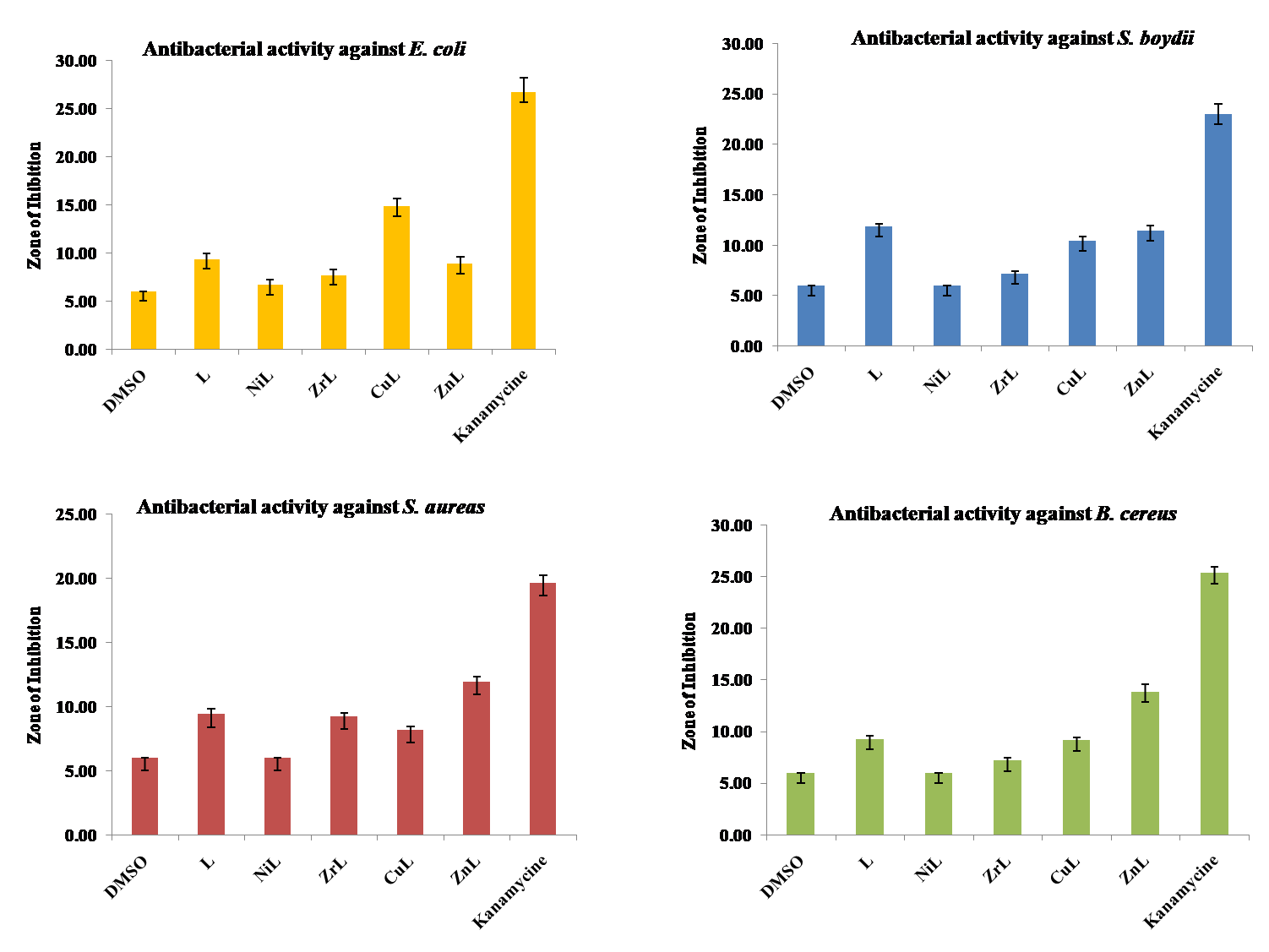 Conclusion: Cu(II), Zn(II), Ni(II), and Zr(IV) Schiff base complexes were synthesized, showing tetrahedral or square planar geometries. They exhibited thermal stability and strong antibacterial activity, outperforming the ligand alone.