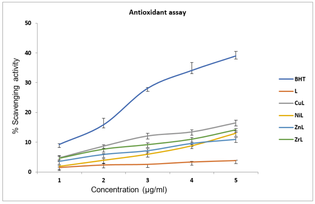 The assessment of the antioxidant characteristics of l and its metal ion complexes was conducted utilizing DPPH, a free radical molecule. The DPPH radical scavenging activity of metal complexes L, and BHT (butylated hydroxytoluene) is presented as a percentage in table 2. The results indicated that all the metal complexes exhibited a moderate level of DPPH radical scavenging activity (fig. X). It is possible to express the sequence as follows: BHT>CuL>NiL>ZnL>L. An analogous pattern was noted regarding the metal complexes that were produced from the l ligand. Cu2+complexes exhibit greater antioxidant activity in both instances compared to other complexes synthesized. The metal complexes derived from the ligand (L) exhibit significantly higher DPPH scavenging activity than the free ligand (L). This indicates that the complexes function as effective antioxidants and free radical scavengers compared to the free ligand (L), albeit at a lower level than standard BHT. It was demonstrated that the radical-scavenging activity of both the standard BHT and the metal complexes increased with increasing concentration. A significant improvement in the antioxidant properties of the ligands was observed upon chelation with transition metal ions. The oxidizing potentials (OP) of the complexes are determined by the presence of compounds whose actions involve the contribution of hydrogen atoms to disrupt the chain of free radicals [37,38]. Thus, the results of this investigation suggest that CuL and ZnL complexes have the potential to be utilized in the treatment of pathological conditions caused by oxidative stress. The IC50 values of each compound mentioned in conjunction with the standard BHT have been computed and are presented in tables 7.