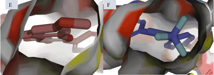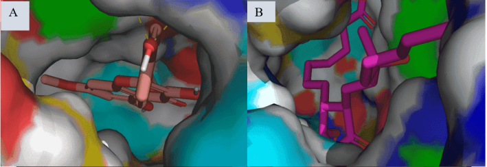 Fig. 2: Surface binding pose of Kaempferol-7-O-methylether (A) and 15R-methyl-prostaglandin-D2 (B) with 7M8W. Kaempferol-7-O-methylether (C) and Diclofenac (D) with 3N8Y (B). Kaempferol-7-O-methylether (E) and Celecoxib (F) with 3LN1