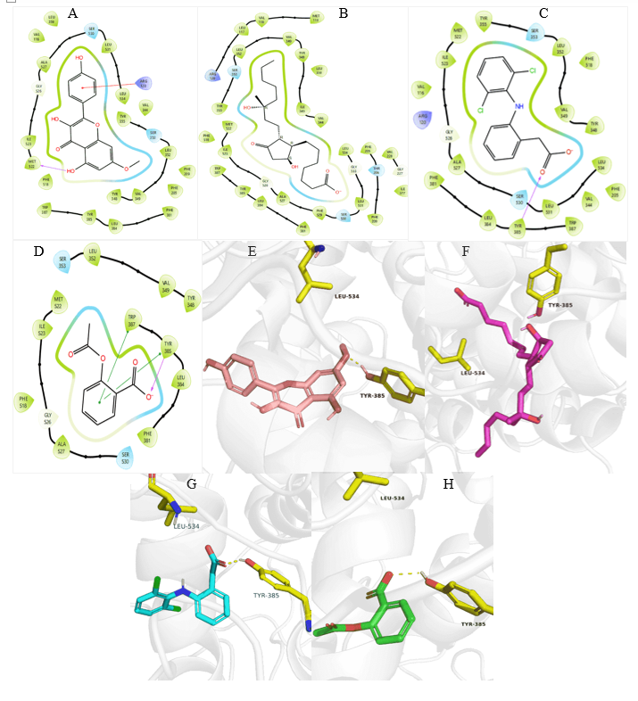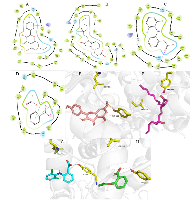 Fig. 4: 3N8Y Protein-ligand interactions: 2D interactions of Kaempferol-7-O-methylether (A) and 15R-methyl-prostaglandin-D2 (B), Diclofenac (C), and Acetylsalicylic acid (D) with 7M8W. 3D interactions of Kaempferol-7-O-methyl ether (E) and 15R-methyl-prostaglandin-D2 (F), Diclofenac (G), and Acetylsalicylic acid (H) with 3N8Y