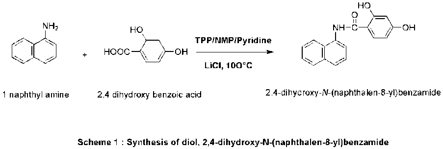 Objective: To synthesize a novel aromatic diol, 2,4-dihydroxy-N-(naphthalen-8-yl)benzamide, and develop polyesters with improved solubility, thermal stability, and flexibility for high-performance applications.