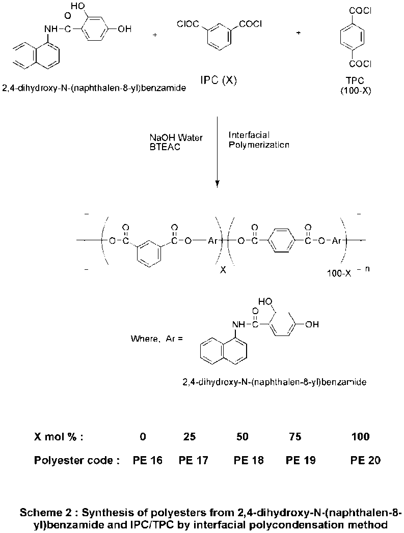 A series of polyesters (PE-16 to PE-20) were synthesized by polycondensation of 2,4-dihydroxy-N-(naphthalen-8-yl)benzamide with varying ratios of TPC and/or IPC in a dichloromethane/aqueous NaOH system, using benzyl triethyl ammonium chloride as a phase-transfer catalyst. All polyesters were obtained in nearly quantitative yields, with inherent viscosities ranging from 0.48–0.92 dl/g (table 2), indicating moderate to high molecular weights, comparable to similar systems reported earlier [6, 7].