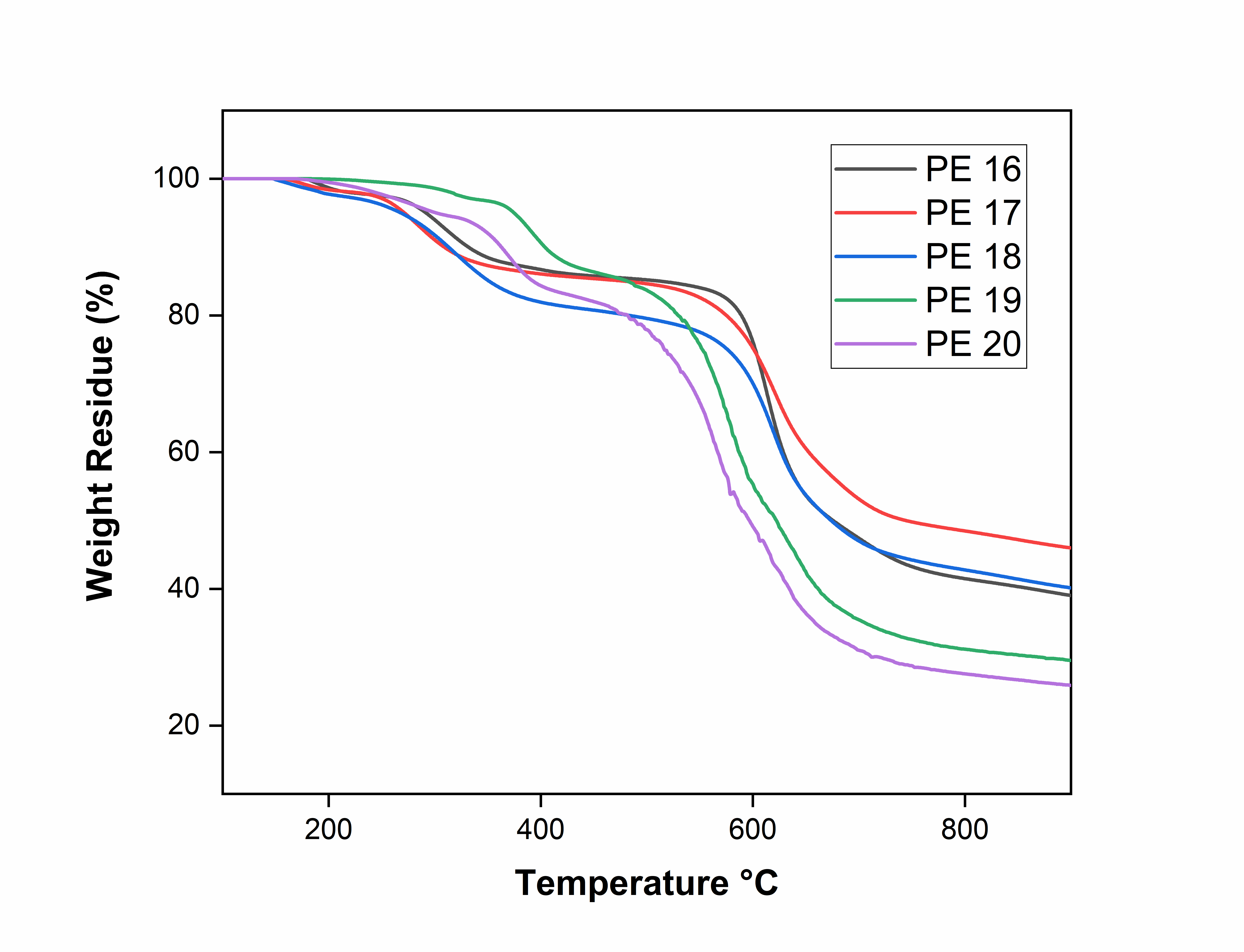 Fig. 5: TGA curves of polyesters, PE-16 to PE-20