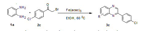 The synthesis of quinoxaline were the model reaction of o-pheneylenediamine (1a) and phenacyl bromide (2c) was carried out in presence iron acetyl acetonate (Fe(acac)3) stirred at 60 °C for 60 min, with good yield 92 % with high purity productsas shown in scheme 1.