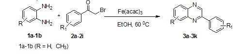 In conclusion, we have developed a mild, efficient, and environmentally benign synthetic protocol for the synthesis of quinoxalines (3a–3k) from substituted phenacyl bromides and o-pheneylenediamines using Fe(acac)₃ as a catalyst. A key feature of this protocol is its simple reaction conditions and the absence of side reactions, leading to the formation of the desired products in high yields. This method serves as an effective alternative to conventional processes for the synthesis of quinoxalines with good to excellent yields (88-94%).