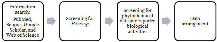 In total, 52 articles were reviewed by using the online search engine PubMed, Scopus, Google Scholar, and Web of Science. Ten species of Ficus were searched for phytochemicals to report their biological activities. Data were arranged according to the species. The workflow is represented in fig. 1.