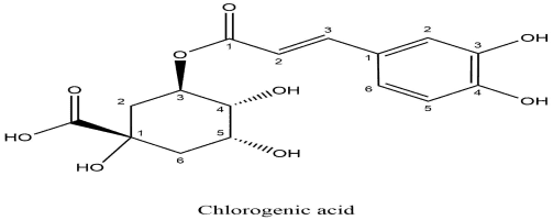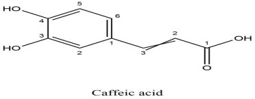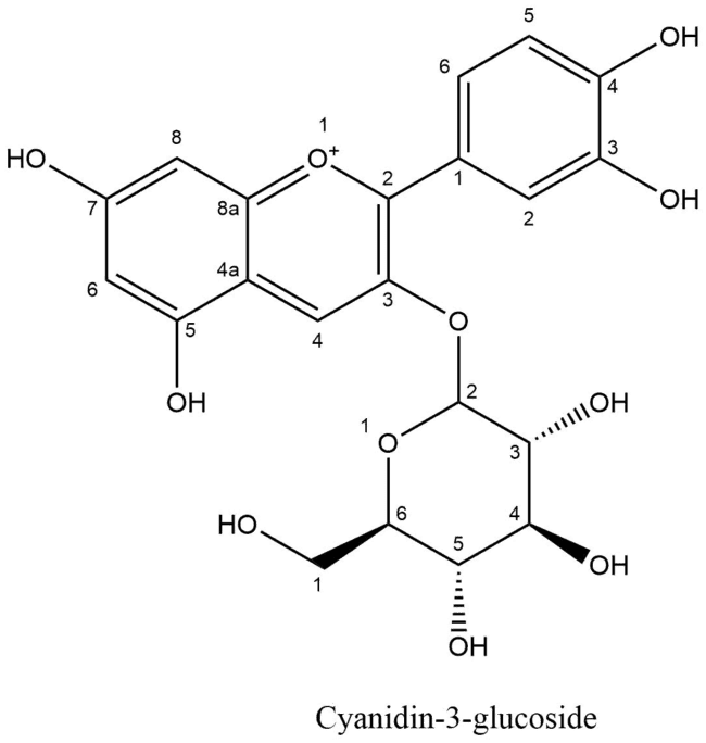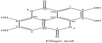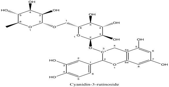 Chlorogenic acid(1), Ellagic acid(2), p-Coumaric acid(3), Kaempferol-rutinoside(4), Quercetin-3-glucoside(5), ferulic acid(6), 5-O-caffeoylquinic acid (7), Apigenin(8), Catechin(9), Epicatechin(10), Cyanidin-3-glucoside(11), Cyanidin-3-rutinoside(12) [32, 34, 37, 38]. |