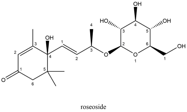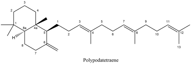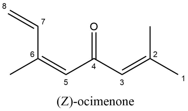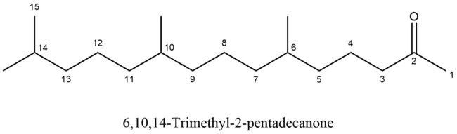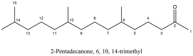vitamins B12 (73), α-thujene (74), α-pinene (75), camphene (76), α-phellandrene (77), p-cymene (78), m-cymene (79), limonene (80), terpinolene (81), safranal (82), (Z)-ocimenone (83), n-tridecane (84),, n-tetradecane (85), cyperene (86), isocaryophyllene (87), α-ionone (88), (E)-β-caryophyllene (89), geranylacetone (90) [56, 57]. |