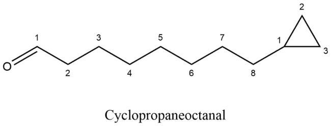 | 42 | Chemical Formula: C18H36O Exact Mass: 268.28 Molecular Weight: 268.49 m/z: 268.28 (100.0%), 269.28 (19.5%), 270.28 (1.8%) Elemental Analysis: C, 80.53; H, 13.52; O, 5.96 |
