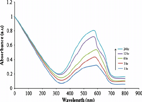 UV-visible absorbance spectroscopy has been proved to be a significant technique for the detection of synthesized metallic NPs because the peak position and shape of the spectra are sensitive to the particle size. The reduction of pure Cu to Copper Nanoparticle was observed by measuring the UV-Vis spectrum, the most confirmatory tool for the detection of Surface Plasmon Resonance property (SPR) of CuNPs. UV-Vis spectral analysis was done by using a UV-Vis spectrophotometer (SHIMADZU) at a range 400 to 700 nm [27-31].