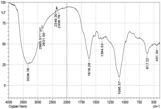 The characterization of functional groups at the surface of Cu nanoparticles by flavonoid(Quercetin) were investigated by FTIR analysis and the spectra were scanned in the range of 4000–450 cm−1. The sample was prepared by dispersing the CuNPs uniformly in a matrix of dry KBr, compressed to form an almost transparent disc. This technique is used to acquire an infrared spectrum of absorption, emission, photoconductivity or Raman scattering of a solid, liquid and gas [27-31].