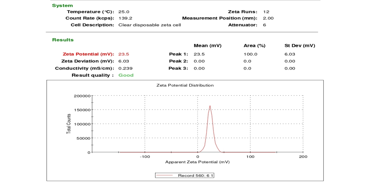 The zeta potential value can be related to the stability of colloidal system. A value of+25 mV to-25 mV can be taken as an arbitrary value that separates low charged surface from a high charged surface. Zeta potential was analyzed by MALVERN ZETASIZER instrument [27-31].