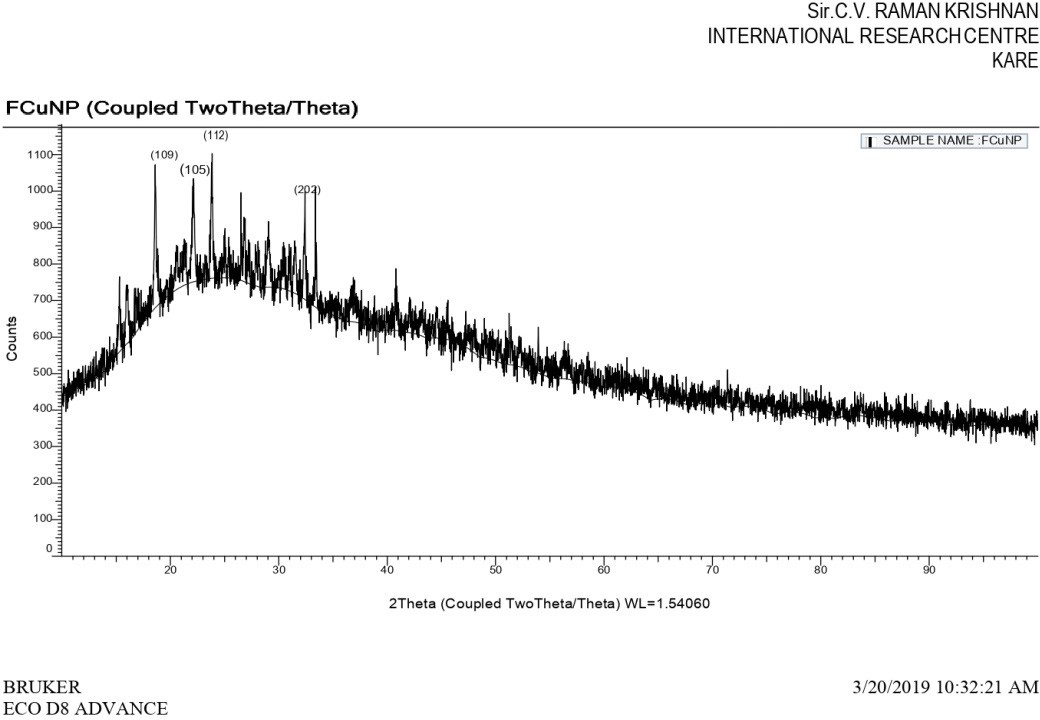 The CuNPs solution was centrifuged, re-dispersed with distilled water and lyophilized to obtain pure CuNPs and CuNPs Pellets. The XRD analysis was done with X-ray diffractometer at a scanning speed of 0.15 ° per min from 10-100 ° (2Ɵ degree). XRD pattern is characterized by the interplanar d-spacing and the relative intensities (I/Io) of the strongest peaks in the pattern under the Hanawalt system. It was acknowledged the position of values of product crystallinity or amorphic nature [27-31].