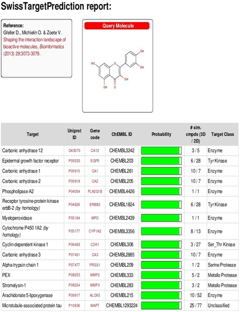 Gfeller D, Grosdidier A, Wirth M, Daina A, Michielin O, Zoete V. Swiss target prediction: a web server for target prediction of bioactive small molecules. Nucleic Acids Res. 2014;42(Web Server issue):W32-8. doi: 10.1093/nar/gku293, PMID 24792161.