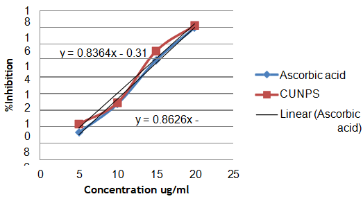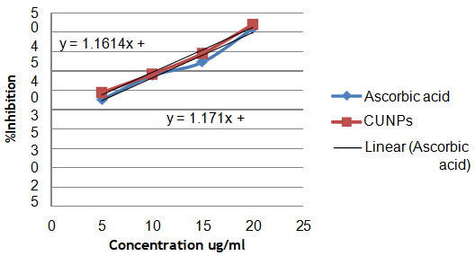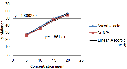 The reducing power ability of CuNPs was screened by assessing the ability of the test extract to reduce FeCl3 solution as mentioned by Oyaizu et al., (1986). 0.1 to 0.5 ml of sample solution (1 mg/ml) was mixed with 0.75 ml of phosphate buffer and 0.75 ml of 1 % Potassium Ferricyanide [K3Fe(CN6)] and incubated at 50 °C for 20 min. About 0.75 ml of 10 % Trichloroacetic acid was added to the mixture and allowed to stand for 10 min. The whole mixture was then centrifuged at 3000 rpm for 10 min. Finally, 1.5 ml of the supernatant was removed and mixed with 1.5 ml of distilled water and 0.1 ml of 0.1% Ferric Chloride solution and the absorbance was measured at 700 nm in UV-Visible Spectrophotometer. Ascorbic acid solution was used as standard and phosphate buffer solution was used as blank solution [33-35].