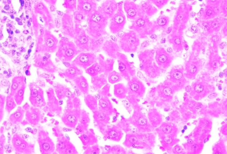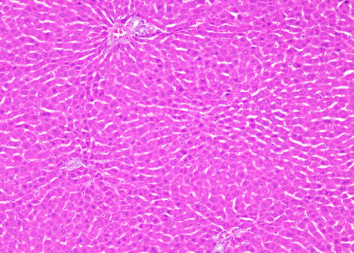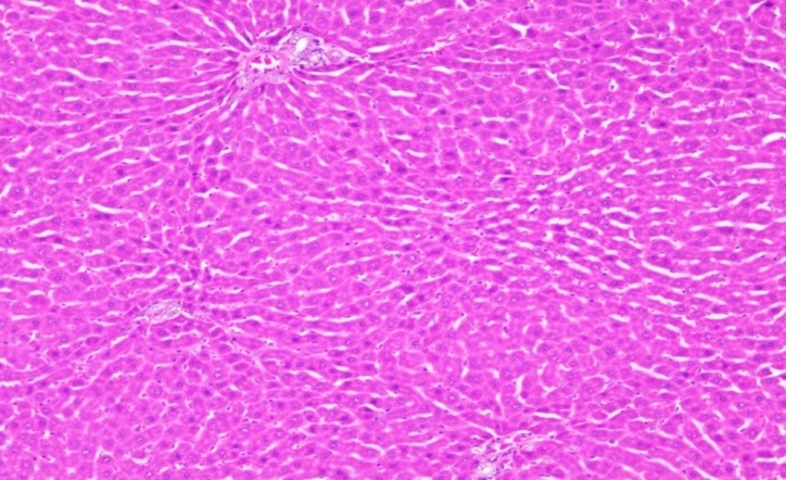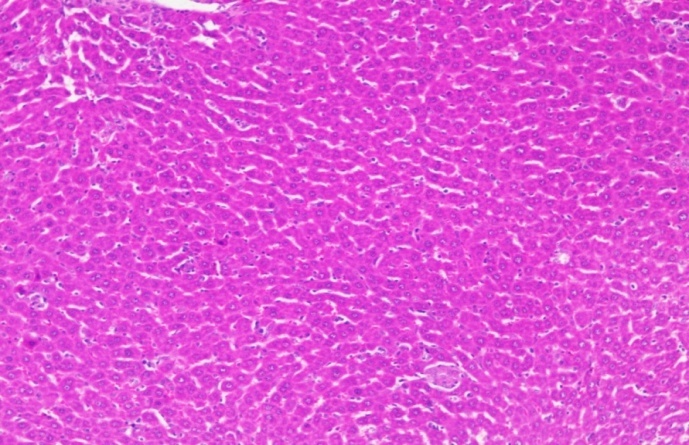 | Section show structure of liver presented mild hepatic congestion at sinusoids and the portal vessel, pericentre globular micro-steatosis, no kuffe cell proliferation, mild hepatocyte diffuse necrosis and mononuclear infiltrate. | Section show structure of liver presented moderate hepatic congestion at sinusoids and the portal vessel, pericentre globular micro-steatosis, less kuffe cell proliferation, mild hepatocyte diffuse necrosis and mononuclear infiltrate. |