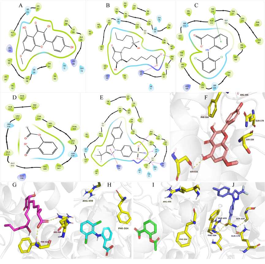 Fig. 5: 3LN1 Protein-ligand interactions: 2D interactions of Kaempferol-7-O-methylether (A) and 15R-methyl-prostaglandin-D2 (B), Diclofenac (C), Acetylsalicylic acid (D), and Celecoxib (E) with 7M8W. 3D interactions of Kaempferol-7-O-methylether (F) and 15R-methyl-prostaglandin-D2 (G), Diclofenac (H), Acetylsalicylic acid (I), and Celecoxib (J) with 3LN1