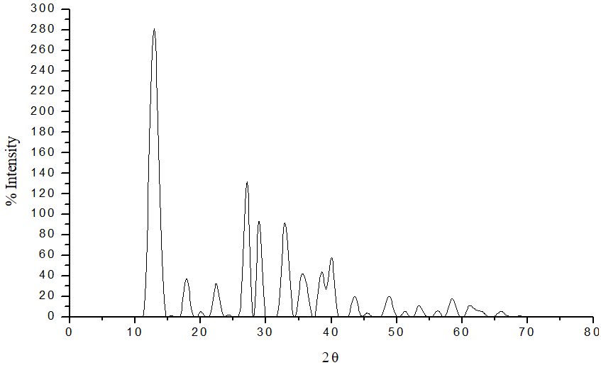 The x-ray diffractogram of Cu (II) complexes of L8 was scanned in the range 20-80° at wavelength 1.543 Å (fig. 2). The diffractogram and associated data depict the 2θ value for each peak, relative intensity and inter-planar spacing (d-values). The diffractogram of Cu(II) complex of L8 had fifteen reflections with maxima at 2θ = 12.89° corresponding to d value 6.86Å. The x-ray diffraction pattern of these complexes with respect to major peaks of relative intensity greater than 10% has been indexed by using computer programmed [35]. The above indexing method also yields Miller indices (hkl), unit cell parameters and unit cell volume. The unit cell of Cu(II) complex of L8 yielded values of lattice constants, a= 9.76 Å, b=10.24 Å, c = 27.24 Å and unit cell volume V=2722.43096 Å3. In concurrence with these cell parameters, the condition such as a = b = c and α = β =γ = 90 required for sample to be Monoclinic were tested and found to be satisfactory. Hence, it can be concluded that Cu(II) complex has an orthorhombic crystal system. Hence, it can be concluded that the Cu (II) complex of L8 has a monoclinic crystal system. The experimental density values of the complexes were determined by using the specific gravity method [31] and found to be 0.8968 gcm-3 for Cu(II) complexes, respectively. By using experimental density values, a molecular weight of complexes, Avogadro’s number and volume of the unit cell were calculated. Number of molecules per unit cell were calculated by using equation ρ = nM/NV and was found Cu(II) complexes respectively. With these values, theoretical density was computed and found to be 0.8858 gcm-3 for respective complexes. Comparison of experimental and theoretical density shows good agreement within the limits of experimental error [33].