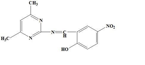 The ligand was prepared by a modification of the reported methods [23-25]. The Schiff base ligand has been synthesized by refluxing a mixture of 0.01 mol (1.2015g) of 5-Nitrosalicylaldehyde and 0.01 mol (1.2710 g) of 2-amino-4,6-dimethylpyrimidine in 50 ml super dry ethanol refluxed for about 4h. Schiff base thus formed was cooled to room temperature and collected by filtration, followed by recrystallization in ethanol and dried in vacuo over anhydrous calcium chloride (Yield: 75%).