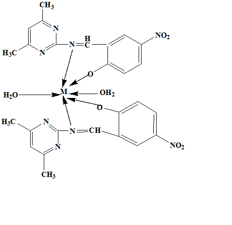 The Schiff bases of 2-amino-4,6-dimethylpyrimidine and its complexes have a variety of applications, including biological, clinical, and analytical. The coordinating possibility of 2-amino-4,6-dimethylpyrimidine has been improved by condensation with a variety of carbonyl compounds. An attempt has been made to synthesize Schiff bases from 2-amino-4,6-dimethylpyrimidine with 5-nitrosalicylaldehyde. Physical characteristics, micro-analysis, and molar conductance data of ligand and metal complexes are given in (table 1 and 2). The analytical data of complexes reveals a 2:1 molar ratio (ligand: metal) and corresponds well with the general formula [ML(H2O)2] (where M= Cu(II). The magnetic susceptibilities of Cu(II) complexes at room temperature are consistent with high spin octahedral structure with two water molecules coordinated to metal ion. The presence of two coordinated water molecules was confirmed by TGA-DTA analysis. The metal chelate solutions in DMSO show low conductance and support their non-electrolyte nature (table 1).