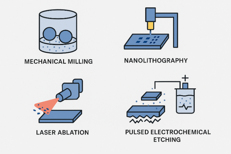In top-down approaches, bulk materials are broken down to produce nanostructured materials. From a granular perspective, top-down methods involve manipulating larger particles, atoms, or molecules to form nanostructures through controlled disintegration or patterning. Techniques used include mechanical milling, nanolithography, laser ablation, sputtering, and pulsed electrochemical etching. This approach focuses on constructing nanostructures by breaking down or sculpting materials from larger-scale entities toward the nanoscale [10, 11]. Method of preparation of Top down and Bottom-up Approach Mentioned in fig. 1, 2 and 3 indicate types of top down and Bottom-up Approach.