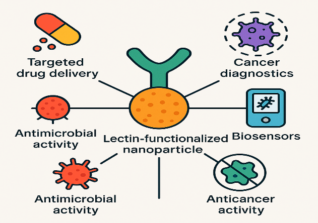 Nanoscience focuses on exploring the distinctive properties of materials within the 1–100 nanometer range, while nanotechnology involves applying this knowledge to design or engineer new materials and devices. By enabling control at the atomic and molecular levels, it becomes possible to develop innovative nanomaterials [1]. Nanotechnology has been a recognized area of research since the last century, initially introduced by Nobel laureate Richard P. Feynman in his landmark 1959 lecture titled 'There’s Plenty of Room at the Bottom [2]. Nanotechnology involves working with materials at the scale of nanometers, one-billionth of a meter, and includes a variety of technologies with practical uses across many fields [3]. Nanotechnology-enabled products are used across diverse sectors, including transportation, energy, electronics, agriculture, environmental science, and consumer goods. Nanotech products can be classified as nanomaterials (e. g., nanoparticles, nanocomposites, nanotubes), nanotools (e. g., instruments with nanoscale components like scanning probe microscopes), and nanodevices (e. g., nanosensors) [4]. This rapidly advancing field is playing a crucial role in driving innovations in medical science, particularly in areas like nanomedicine. It enables the exploration of biological processes at a scale and precision that were previously unattainable. Applications of nanotechnology in medicine include the creation of nanoparticles for diagnostics and early disease detection (such as cancer), the engineering of artificial cellular components like receptors, and advancements in DNA and protein sequencing through techniques like nanopores and nanosprays. Additionally, it supports the development of novel drug and nutrient delivery systems, as well as emerging approaches in gene therapy and tissue engineering [5, 6]. Among emerging nanomedicine platforms, lectin-functionalized nanoparticles have gained attention for their ability to selectively bind carbohydrate residues on cell surfaces, offering promising potential for targeted drug delivery, cancer diagnostics, and pathogen detection [7]. Lectins are proteins that selectively bind to specific carbohydrates on cell surfaces, exhibiting high molecular specificity. This targeted interaction is essential for key biological processes such as cell recognition, communication, and adhesion, facilitating accurate molecular signaling and physiological functions [8, 9]. Integrating lectins with nanotechnology has advanced targeted therapies by enabling nanoparticles to recognize specific glycan patterns on cells, enhancing precision in drug delivery and diagnostics [7].