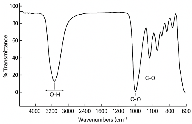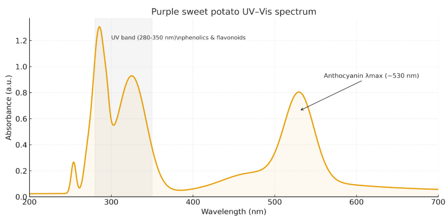 The UV–Vis spectrum of the purple sweet potato extract (fig. shown) displays prominent absorbance peaks in the visible region between 250–550 nm, with the highest absorbance values recorded in the range of 280–350 nm and noticeable tailing towards 500–550 nm. This spectral behavior is characteristic of anthocyanins, the major natural pigments present in purple sweet potatoes (Ipomoea batatas L.). Anthocyanins are flavonoid compounds that exhibit strong absorbance in the UV and visible regions due to their conjugated double bond systems and chromophoric structures [12].